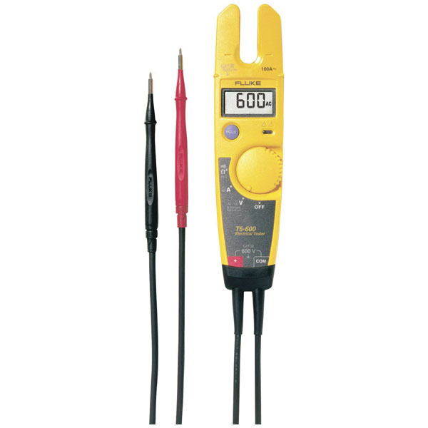 Tester for voltage, continuity and current. The fixed fork allows the testing of currents without breaking the circuit. The test leads can be stored on the back side, saving space. Available in two versions for 600 V and 1000 V.