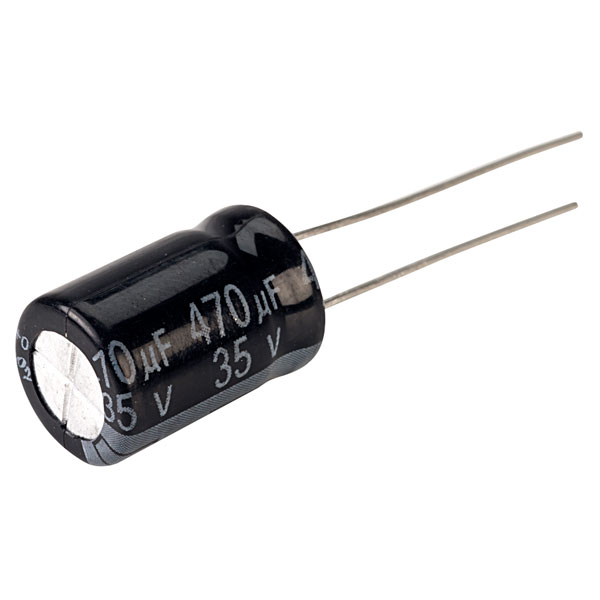 A 35V 470µF miniature radial lead aluminium electrolytic capacitor that mounts directly onto a PCB. Manufactured to high technical and quality standards.