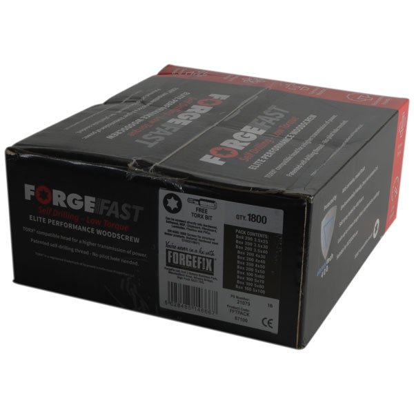 This ForgeFix ForgeFast Torx® Compatible Wood Screw Pack contains a selection of the most popular sizes of professional, high performance multi purpose woodscrews. With a universally accepted, Torx® compatible drive. Their recessed ribs provide improved countersinking and reduced surface dust, and their reinforced countersunk necks improve holding power.
