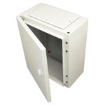 The enclosure is made from high quality cold-rolled steel plate up to 2mm thick and coated with RAL 7035 hardened epoxy-polyester paint. The enclosure can be fastened directly to a wall by using the outside flanges, guaranteeing the IP protection rating. Bolts are provided in both the cabinet and in the door, allowing connection via an earth cable to guarantee electrical connectivity between the door and base of cabinet.