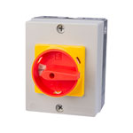 The switch features a red handle with yellow shroud, and is used to isolate power in EV installations for safety and maintenance purposes.