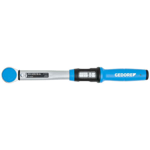 The Gedore torque wrench TF-K100, model 3278379, is a robust tool designed for precision torque applications. It features a range of 20 to 100 Nm with a 1/2" (12.5 mm) drive. Commonly used in automotive and mechanical settings, it ensures accurate tightening of fasteners.
