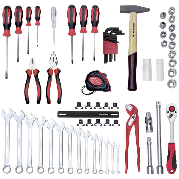 The Gedore RED tool kit is a comprehensive set of assorted tools designed for various repair and maintenance tasks. Manufactured by Gedore, it features high-quality tools suitable for both professional and home use. Ideal for technicians and DIY enthusiasts, it ensures reliability and efficiency in handling diverse applications.