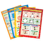 A set of 4 high quality A1 gloss posters featuring Angle Properties, Angles & Measurements, Circle Properties and Area & Perimeter.