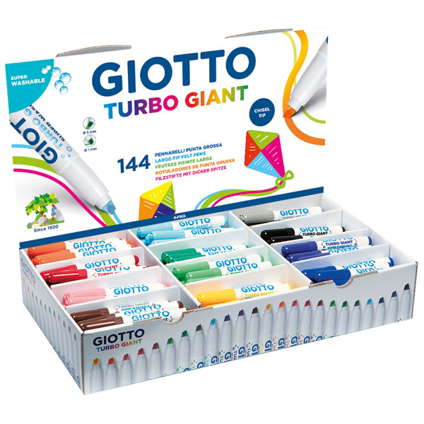 These GIOTTO Turbo Giant Chisel Tip felt-tip pens are perfect for school or home use. The chisel tip allows you to draw lines with a diameter of 1 and 5 mm. The colours are water-based and super washable and the pens have a ventilated choke proof cap, child proof stopper and an extra strong tight fitting nib. They come in a school pack of 144 pieces.