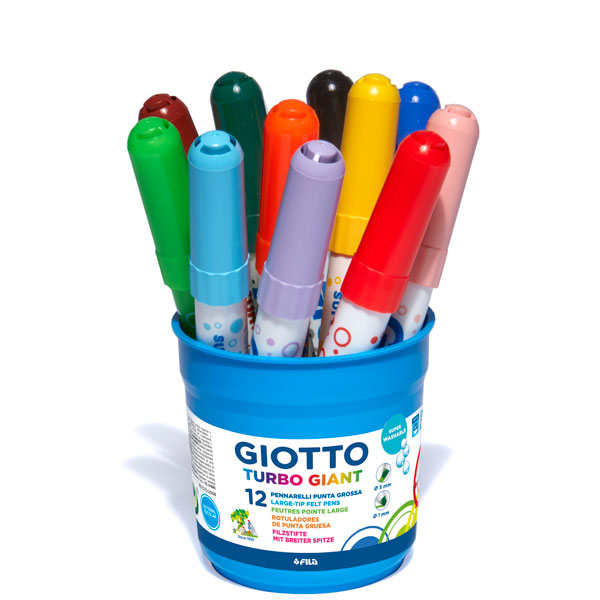 These GIOTTO Turbo Giant Chisel Tip felt-tip pens are perfect for school or home use. The chisel tip allows you to draw lines with a diameter of 1 and 5 mm. The colours are water-based and super washable and the pens have a ventilated choke proof cap, child proof stopper and an extra strong tight fitting nib. They come in a pot of 12 assorted colours.