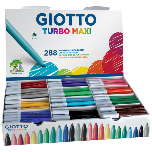 These GIOTTO Turbo Maxi felt-tip pens are perfect for school or home use. The colours are water-based and super washable and the pens have a ventilated choke proof cap, child proof stopper and an extra strong tight fitting nib. They come in a School pack of 288 pieces.