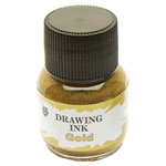 Gold drawing ink from Ocaldo, prepared from fine metallic powders dispersed in a water soluble gum medium.