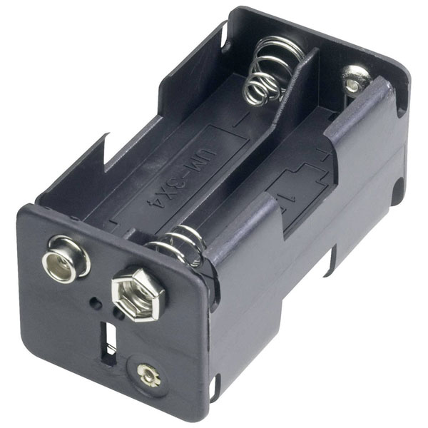 The Goobay 12466 battery tray is designed to hold four AA batteries, measuring 61.5 x 30 x 31.5 mm. It features a stud and socket connection for secure placement and efficient power management. Typically used in electronic devices as a reliable power source, this black holder is a crucial accessory in battery management setups.