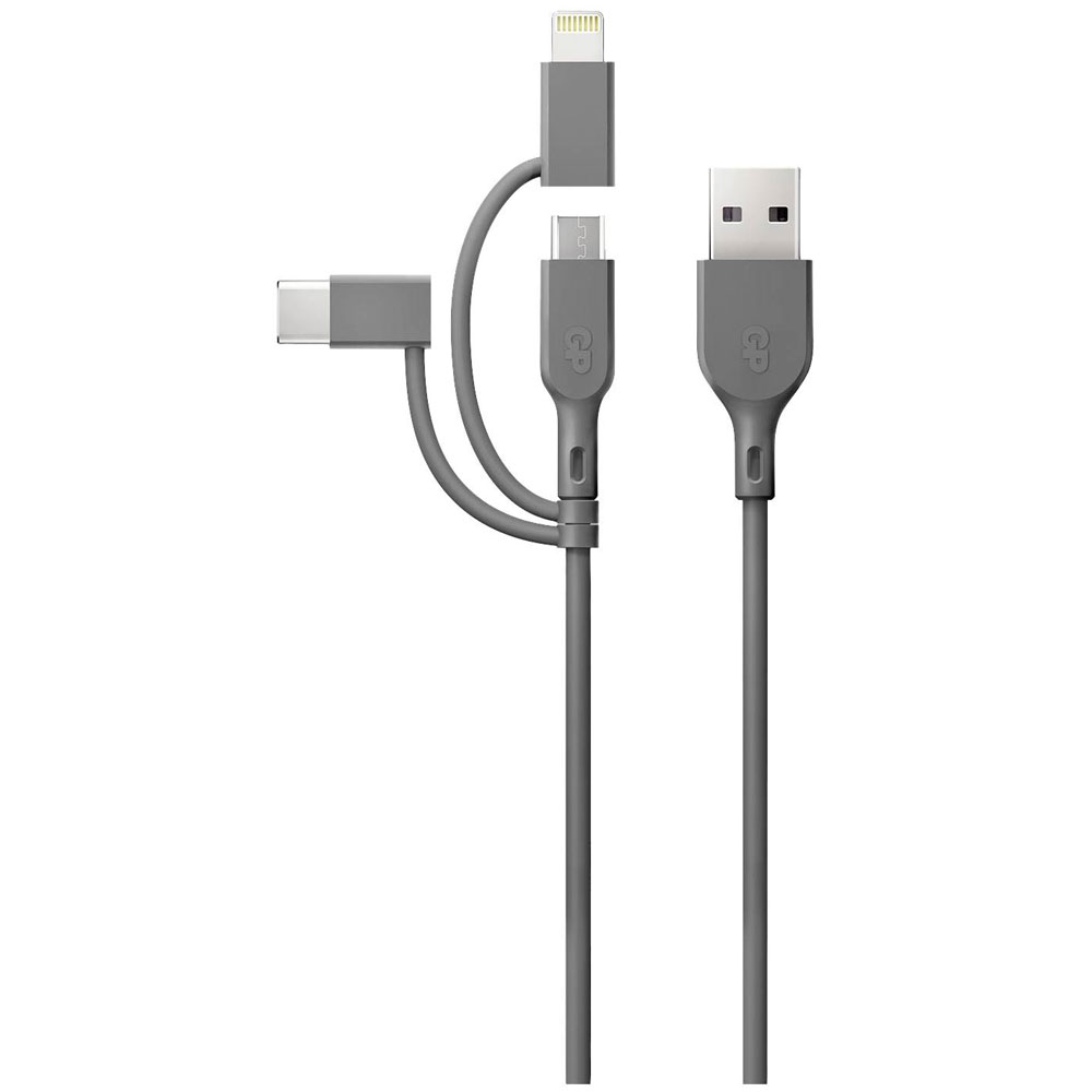 GP Batteries GPCBCY1NGYUSB313 is a versatile USB charging cable designed for multi-functional use, featuring connectivity between USB-A, Apple Lightning, USB Micro-B, and USB-C interfaces. This grey cable offers a length of 1.00 metre, providing flexibility and convenience for various charging and data transfer requirements. Constructed to support USB 2.0 data rates, it is suitable for integration into electronics where seamless connection between devices is essential, such as in mobile device charging, syncing with computers, and interfacing with peripheral devices. Its multi-plug capability makes it ideal for engineers who require reliable connectivity solutions across different device standards, thus enhancing productivity in environments where multiple device types are in circulation. The robust design ensures durability, applicable in both domestic and professional settings.