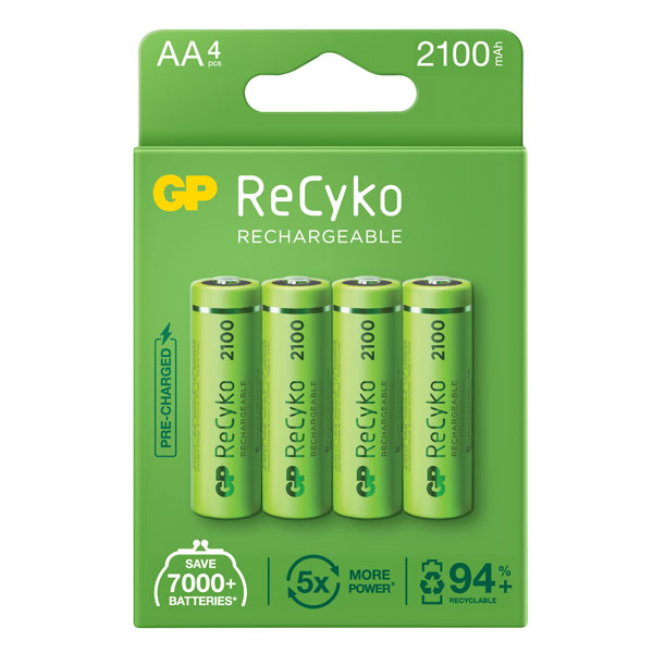 These ReCyco rechargeable nickel metal hydride (NiMH) batteries from GP offer a greener choice than standard, single-use disposable batteries. Their new packaging is even easier to recycle.