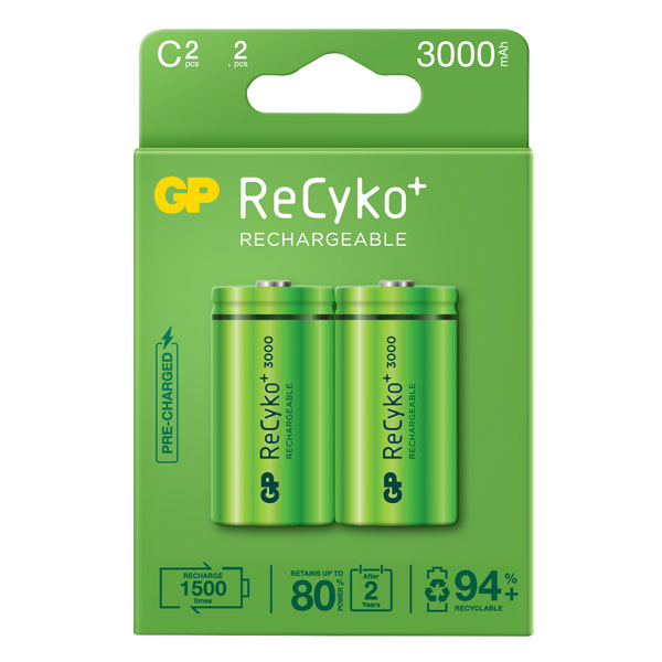 A pack of two ReCyko rechargeable C batteries with a capacity of 3000mAh.