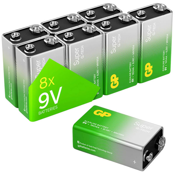 The GP Super 9V batteries are reliable alkali-manganese power sources, offered in an 8-pack. Manufactured by GP, these PP3 batteries are ideal for devices requiring consistent and long-lasting voltage, such as smoke alarms and remote controls. Compatible with various identifiers like 6LR61 and MN1604, they assure flexibility across multiple applications.