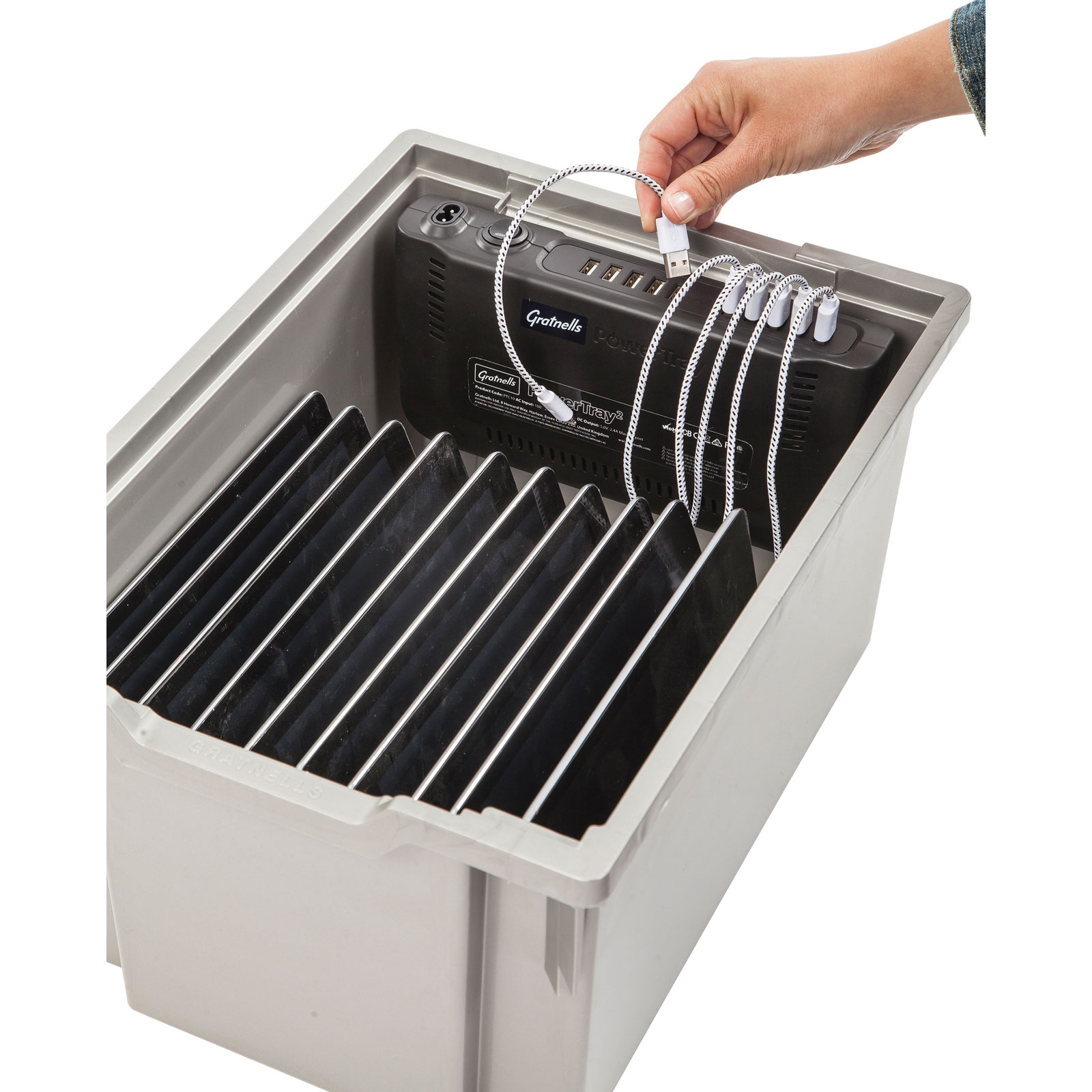 The PowerTray2 is the latest addition to the Gratnells product range and is the ultimate solution in mobile device storage and charging. It can charge up to 10 USB devices, each at optimum speed, thanks to its built-in digital device recognition technology.