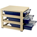 • Complete 3-tier kit consists of 1x top, 3x base/shelf, 1x pack of 4 base plugs, 3x pack of 4 stackers, 3x shallow trays (14-0430) and 3x tray lids (14-0436)