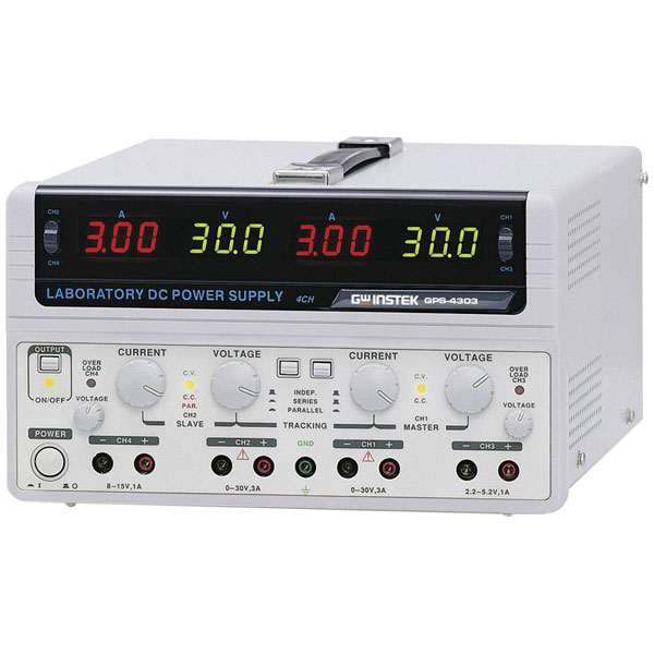 The GPS-4303-E from GW Instek is a regulated DC power supply with 4 independent, isolated outputs that can be operated in series, parallel and tracking modes. Its two main outputs can be set 0-30Vdc and 0-3A, while its third auxiliary output offers 2.2-5.2Vdc (1A limit) and its fourth output 8-15V (1A limit).