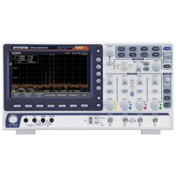 The models MDO-2000 EC have a built-in spectrum analyser and a 2-channel 25 MHz Arbitrary Waveform generator and the models MDO-2000EX has a built-in spectrum analyser, a arbitrary waveform generator, a 5000 Count Digital multimeter and a 5V/1A power supply.