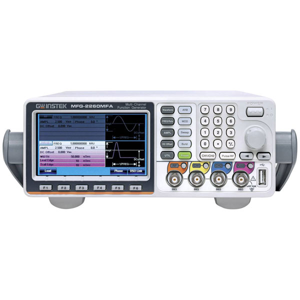 MFG-2000 series, which has up to 5 simultaneous output channels (MFG-2260MFA/MFG-2260MRA), including CH1 and CH2 equivalent performance dual channel arbitrary function generator with the maximum 60MHz for both channels; RF signal generator, a standard AFG, which produces the maximum 320MHz sine wave and various modulation RF signals; pulse generator, whose frequency reaches 25MHz; power amplifier, which is ideal for audio range. The above-mentioned five different functionality channels are separately or totally allocated on 10 models, which extend from the basic single-channel AFG with pulse generator models to five-channel models so as to satisfy various educational and industrial applications.