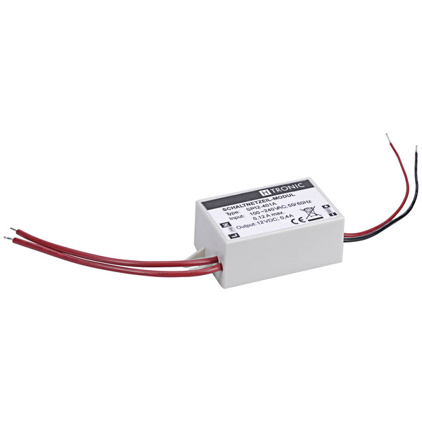 The H-Tronic SP-12-401 A is an AC/DC power supply unit delivering 12 V DC at 0.4 A with a power output of 4.8 W. It is a PCB mount unit equipped with solder lugs, making it suitable for printed circuit board applications. Typical uses include powering small electronic devices and projects requiring reliable DC power conversion.