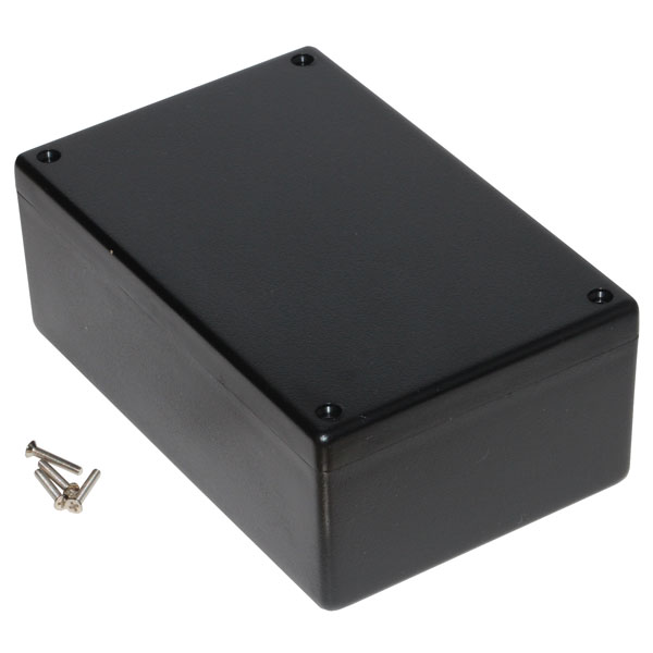 Rugged electronic instrument enclosure from Hammond, made from black ABS material, 3.3mm thick, ideal for mounting printed circuit boards.