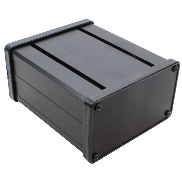 Aluminium extruded enclosure ideally suited for mounting PCBs. The single piece extrusion features a finned design to assist with cooling and is supplied with aluminium end panels and moulded plastic bezel. T slots in the enclosure provide wide range of mounting options. Supplied anodised in either black or clear finish. Colour Black. Dimensions (mm) 100 x 90 x 51.