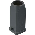 Black thermoplastic top entry hood with two pegs from the Harting Han® 3 A Series of industrial connectors.