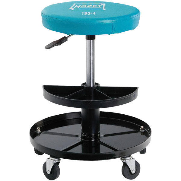 The Hazet 195-4 Pneumatic Chair/Work Stool is a movable chair with pneumatic seat height adjustment, ideal for the work place, including garages and workshops. Designed with comfort in mind and boasting a cushioned seating area of Ø 320mm in light blue, plus two integrated tool storages rotating by 360°.
