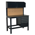 Heavy-duty steel powder coated workbench with laminated worktop. Four drawers on smooth 25mm roller ball-bearings and two top storage cupboards. Pegboard back panel with hooks for convenient tool storage.