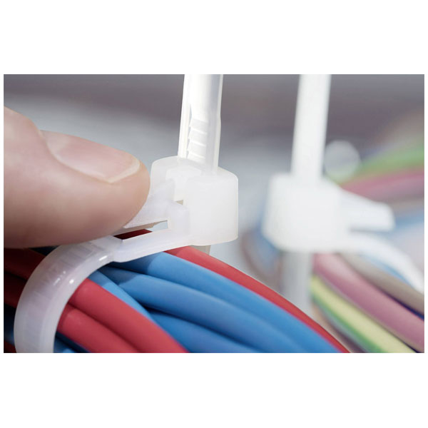 HellermannTyton's 131-21419 REL140-PA66-NA cable tie is 150 mm in length and 7.60 mm wide, featuring a lever lock for easy release and reuse. Made in ecru, this cable tie is ideal for cable bundling and management applications where re-opening is necessary. It is perfect for situations requiring detachable fastening and secure cable mounting.