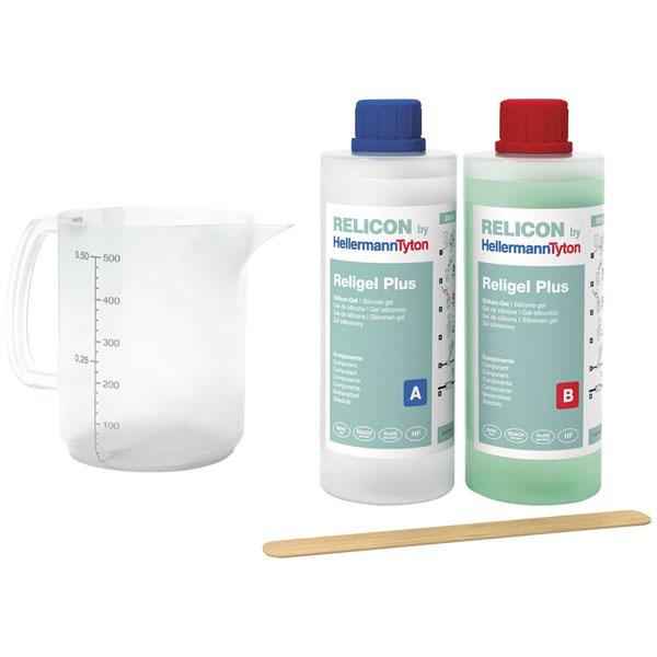 The HellermannTyton 435-00756 Religel Plus 500ml-SIG-GN is a 2-component gel designed for cable repair and protection. It serves as a cable repair sleeve or protective ground sheath, ideal for maintaining cable integrity. This product provides secure insulation and safeguarding for various electrical connections.