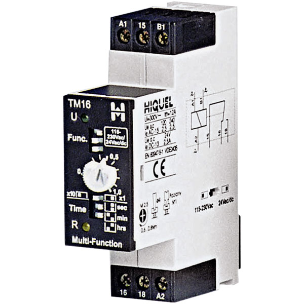 This multifunction DIN rail mounting timer relay has 8x timing functions, selectable by DIP switch, that include: delayed drop off, delayed pick up, momentary pick up with impulse control, momentary On/Off, momentary drop off with impulse control, momentary pick up, flash starting with pause, flash starting with pulse. There are 8x selectable time ranges from 1s to 100h that are easily set on the front panel.