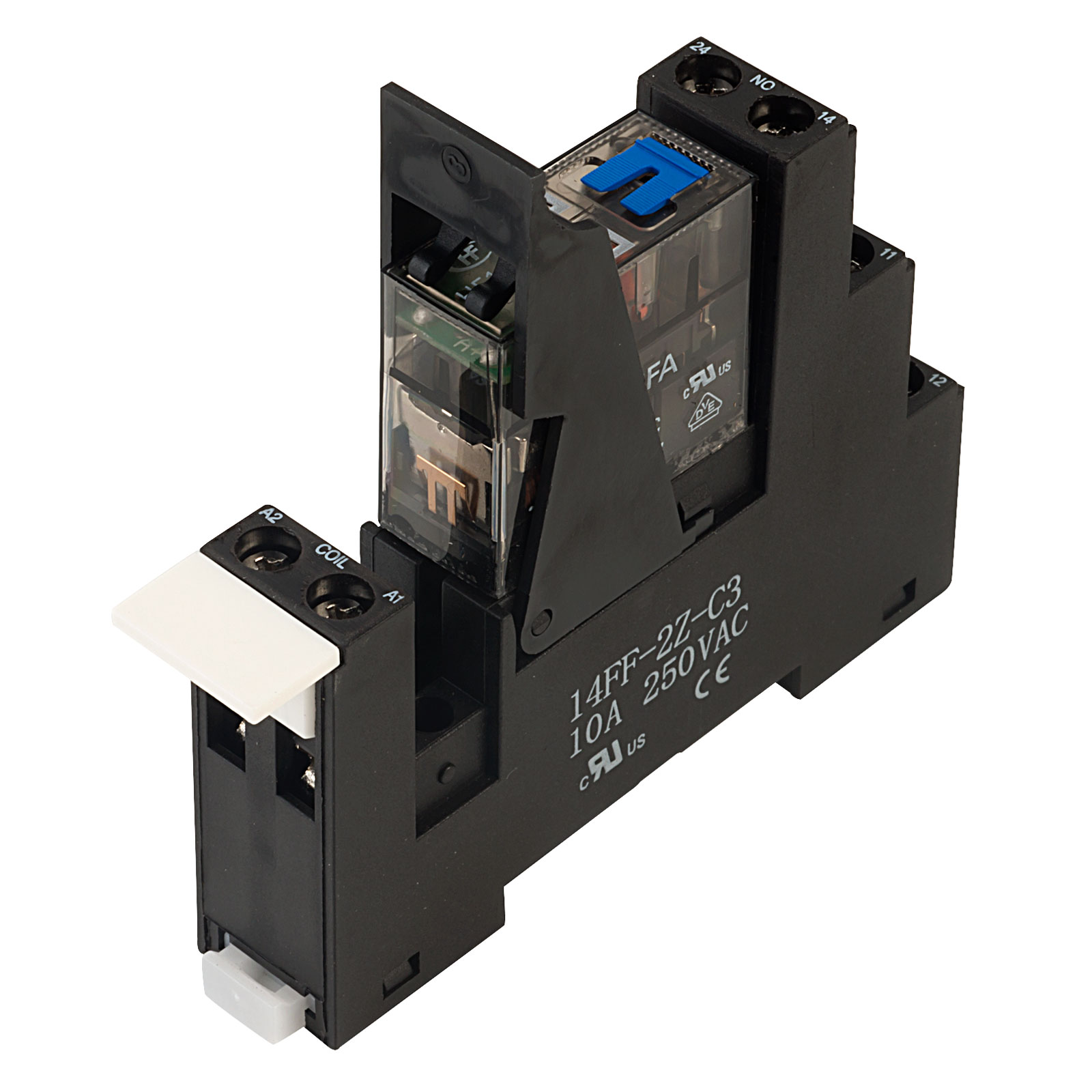 An 8A 24V DC double pole relay interface module that features coil/contact separation. The module is supplied complete with relay, socket, LED, ejector clip and identification label, making it easy to order all these components with just one part number. Suitable for many applications, e.g. industrial automation, heating and cooling systems, elevators, etc.
