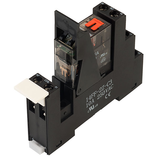 An 8A 230V AC double pole relay interface module that features coil/contact separation. The module is supplied complete with relay, socket, LED, ejector clip and identification label, making it easy to order all these components with just one part number. Suitable for many applications, e.g. industrial automation, heating and cooling systems, elevators, etc.