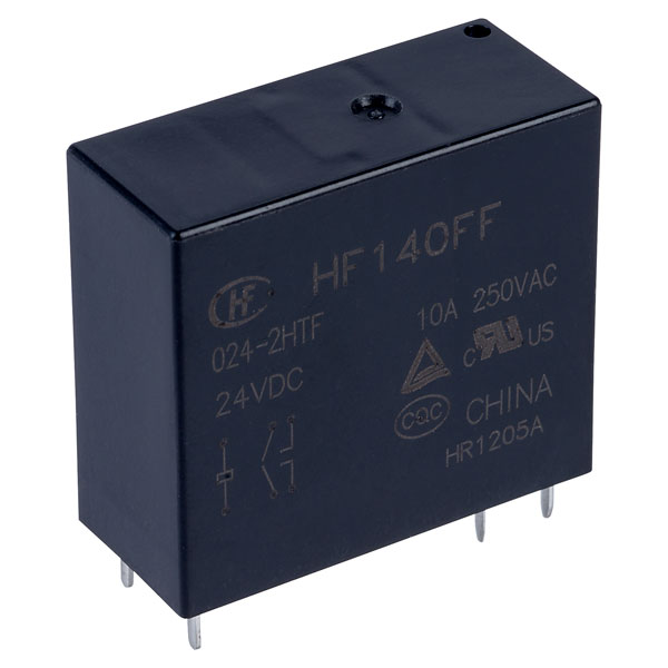 A 10A miniature intermediate power relay from the HF140FF series that is designed for PCB mounting. The relay has a 24V DC coil and a DPST-NO contact configuration.
