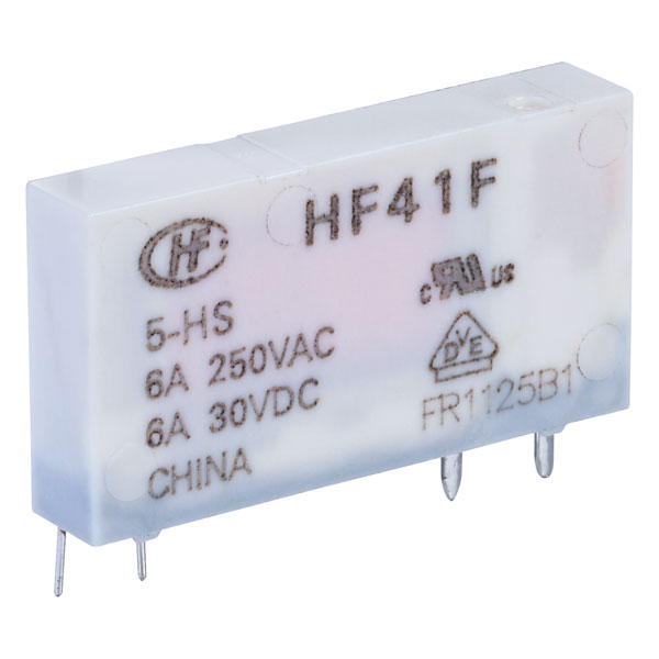A 6A subminiature power relay from the HF41F series that is designed for PCB mounting. The relay has a 5V DC coil and a SPST-NO contact configuration. Its slim width of just 5mm makes it ideal for applications where space is tight.