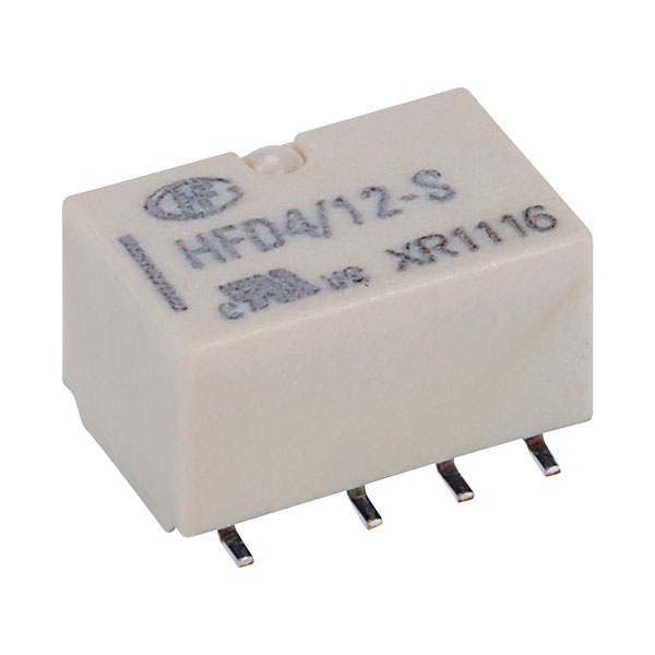A 2A subminiature signal relay from the HFD4 series with a single side stable 12V DC coil and a DPDT contact configuration. Comes in a SMT package.