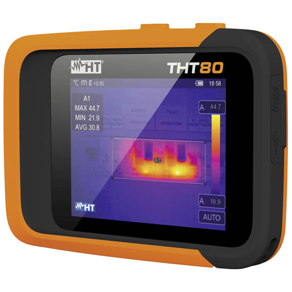 HT Instruments THT80 is an infrared camera with a temperature range of -20 to +550 °C and a 25 Hz built-in digital camera. Its main features include Wi-Fi connectivity and a touchscreen interface. This thermal imager is ideal for thermography applications such as building inspections and electrical maintenance.