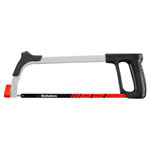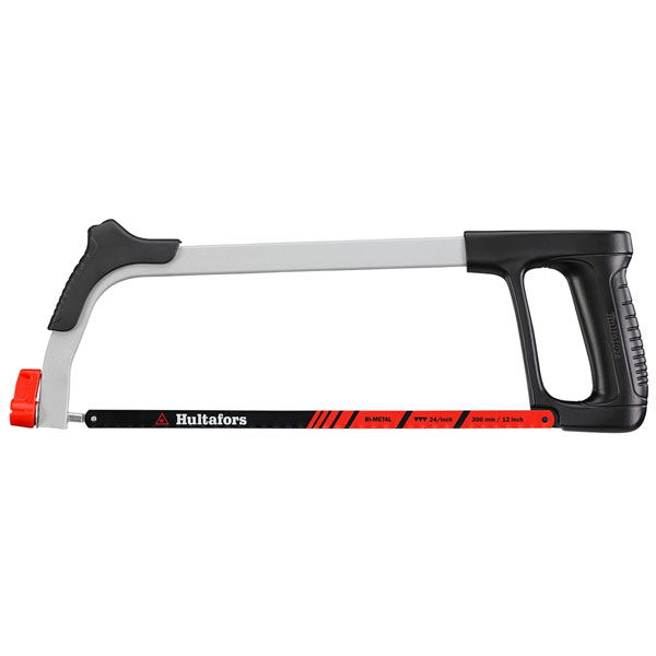 The Hultafors HMS-12 Hacksaw with a steel frame. Its ergonomically shaped handle is made from cast aluminium and complemented with a grip friendly plastic support at the front of the frame to maximize the user friendliness. The blade can be tilted for cutting close to a flat surface without loss of performance and precision.