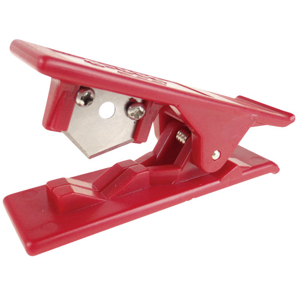 A red plastic cutter that is suitable for cutting hoses made of PU, PE, PA, PVC, PTFE and other plastics. Useful for the following range of applications: pneumatic, gas, water, current and installation.