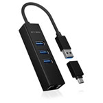 ICY BOX IB-HUB1419-LAN, a robust USB hub offering four additional USB 3.2 1st Gen ports, designed to enhance connectivity options for computing systems. This hub features backward compatibility with USB 2.0 and USB 1.1, ensuring versatile use across a range of devices. Constructed in a sleek black finish, the device is tailored to applications requiring expanded USB interfacing, such as data transfer, peripheral connectivity, or network device integration, thanks to its Ethernet support. Typically deployed in environments necessitating reliable data throughput and connectivity, such as offices, engineering labs, and home workstations, the IB-HUB1419-LAN efficiently increases the number of USB slots available to any PC or compatible device.