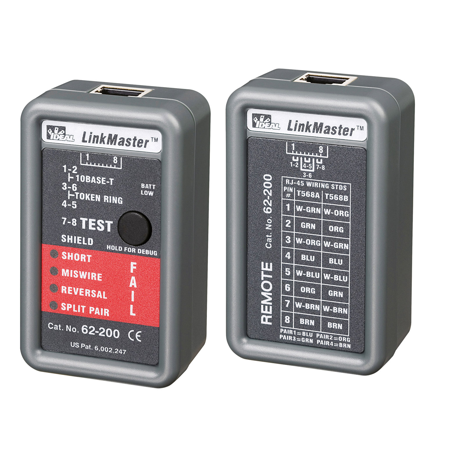 The LinkMaster is a unit that is used to test wiring configurations for both Shielded Twisted Pairs (STP) and Unshielded Twisted Pairs (UTP). The device checks for continuity, shorts, miswires, reversals and split pairs. There is a main unit and remote unit so that it is possible for one person to carry out tests to T568A, T568B, 10Base-T, and Token Ring standards.