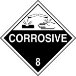 This warning label reads CORROSIVE. The Hazard Class '8' is shown at the bottom of the sign