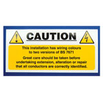 These CAUTION labels warn others that; This installation has wiring colours to two versions of BS 7671.