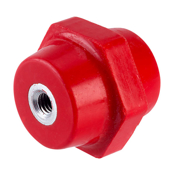 A glass-filled polyester insulating spacer with two internal M6 metal threads that are insulated from each other.