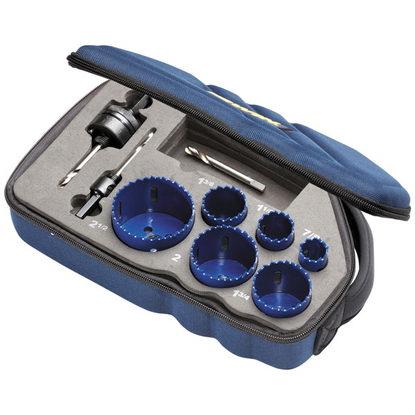 Irwin Bi-Metal Holesaw Kits are available in a unique attractive soft storage case that incorporates an unbreakable hinge and internal padding that protects its contents. The case has an integral handle and has a cardboard sleeve that contains important product information.