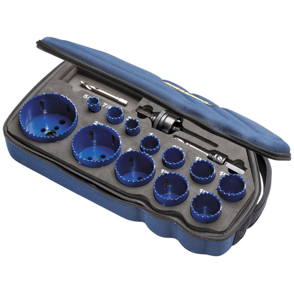 Irwin Bi-Metal Holesaw Kits are available in a unique attractive soft storage case that incorporates an unbreakable hinge and internal padding that protects its contents. The case has an integral handle and has a cardboard sleeve that contains important product information.