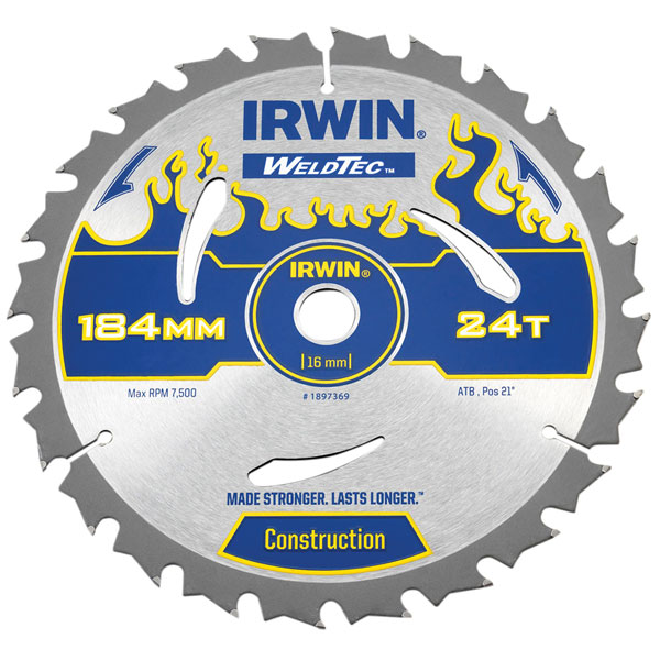 Irwin Weldtec Circular Saw Blade with welded carbide teeth for a substantially stronger tooth bond and longer life. The ultra compact carbide is 70% tougher than standard carbide for superior sharpness and cut quality.