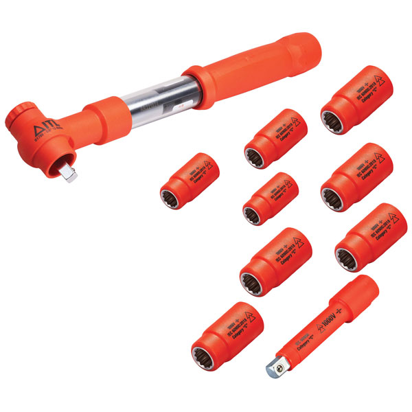 The ITL 10 Piece Insulated 3/8in Drive Metric Torque Wrench Kit. The tools in this set are manufactured from injection moulded nylon thermoplastic, and are 100% tested to IEC60900, Category C and ASTMF1505. They are designed to withstand extreme impact, abrasion, and are flame retardant.