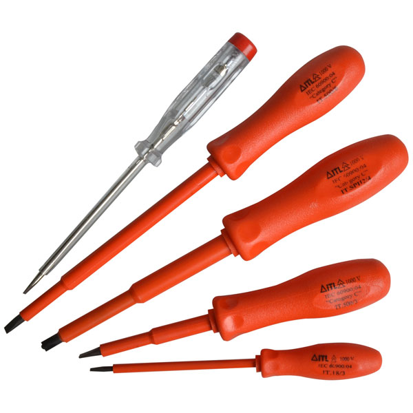 International insulated screwdriver set of 5 with injection moulded nylon 11 handles, which exceed the requirements of IEC 60900, the industry standard for live line working.
