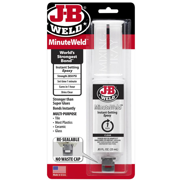 J-B Weld MinuteWeld™ is a specially formulated, high-strength, two-part instant setting epoxy. MinuteWeld™ will set under most temperature conditions in one minute. Designed to adhere to multiple surfaces and can be used on ceramic, tile, glass, stone, most plastics, wood and metal.
